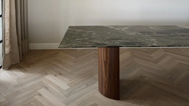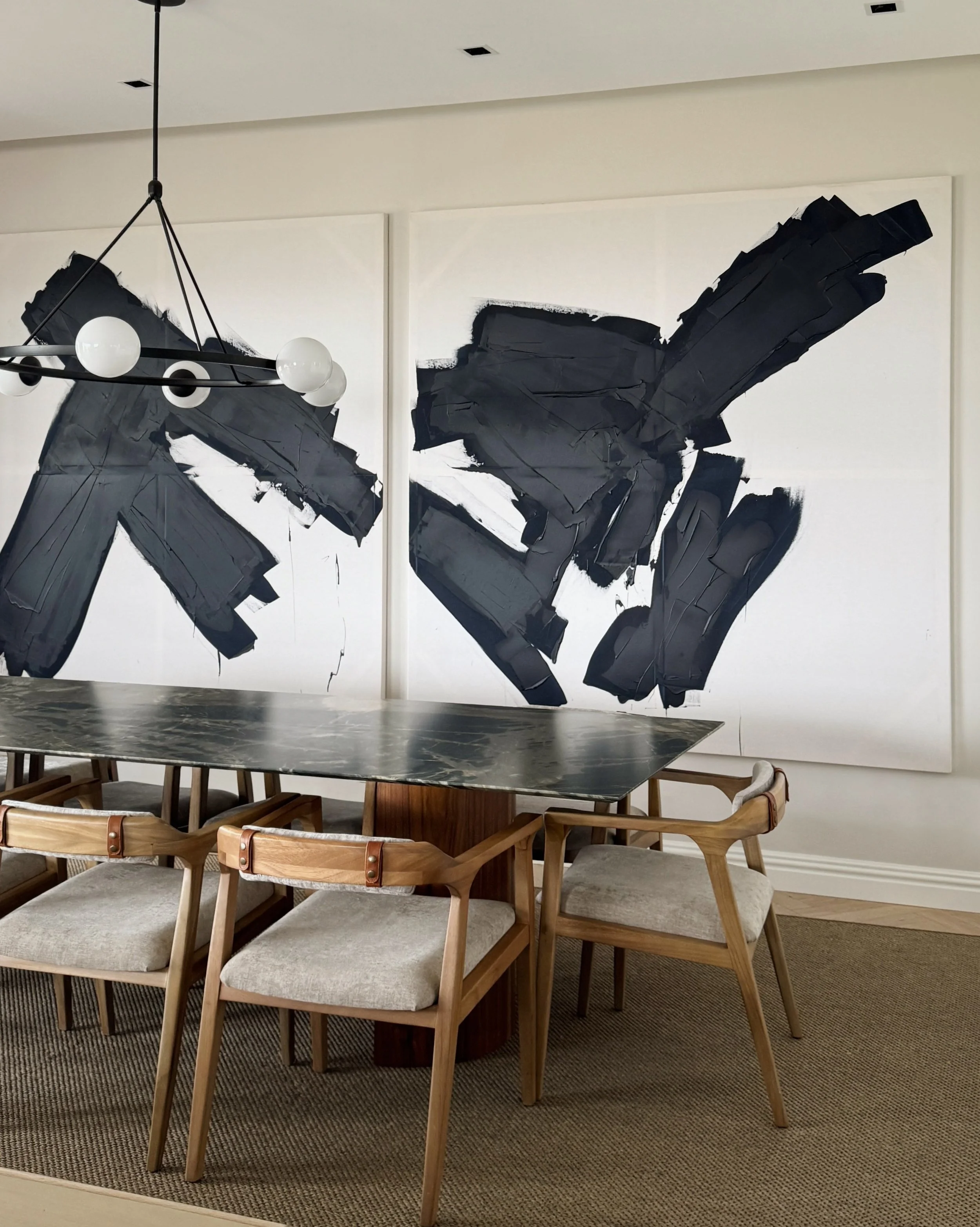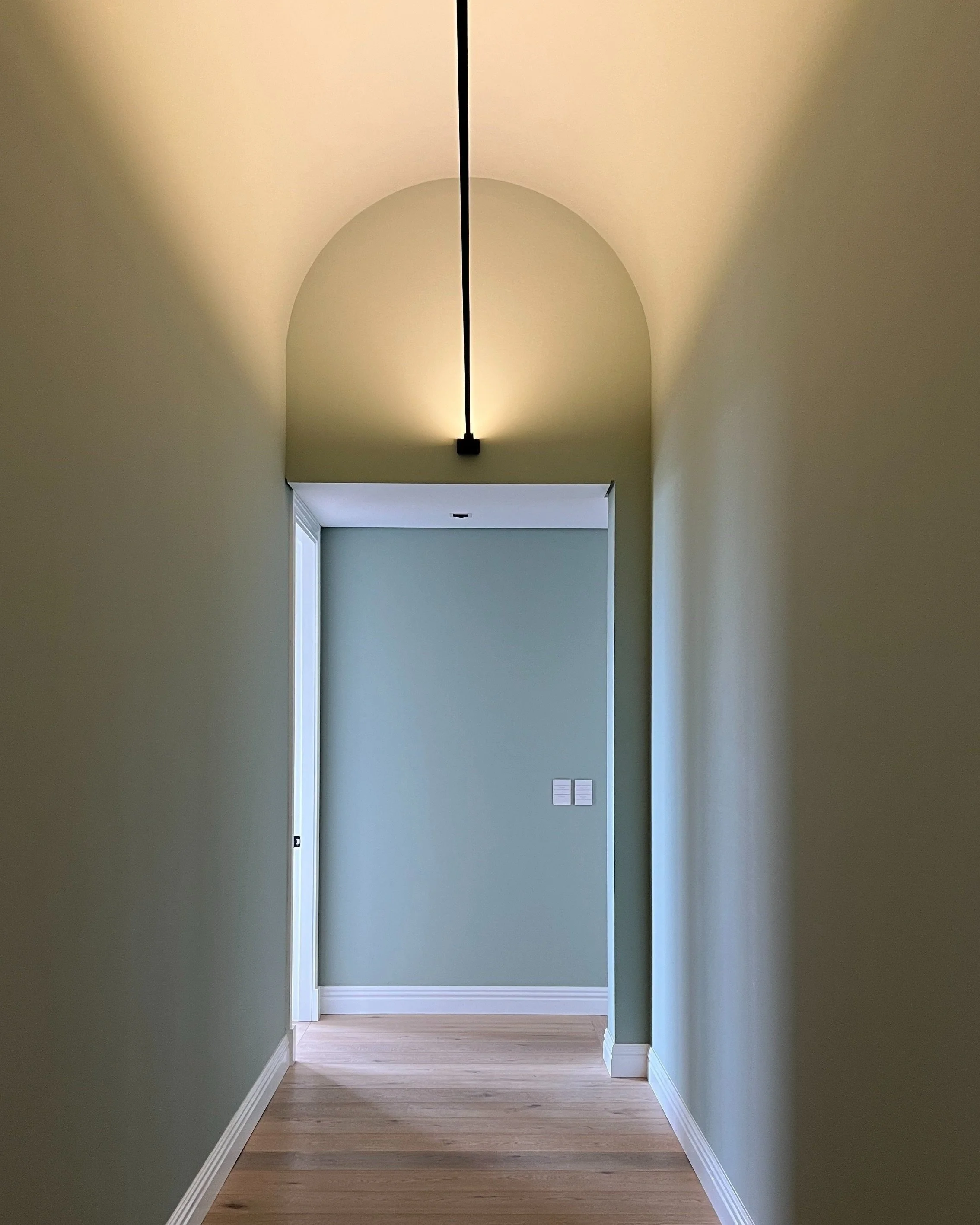 The architectural and interior design project features a harmonious blend of personalized elements that enhance the overall aesthetic of the space. A custom painting, created by the designer, adorns the wall, adding a unique touch that reflects the client's vision. The table, crafted from Brazilian green quartzite, serves as a striking centerpiece, seamlessly integrated into the environment. The custom arched ceiling not only elevates the design but also creates a sense of openness and flow throughout the room. Additionally, the redesigned flooring and a modernized kitchen complement these features, resulting in a thoughtfully curated space that balances functionality with artistry.